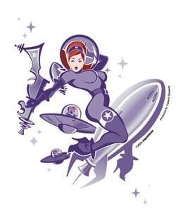 Retro is the in thing, but I've lusted at retro for much, much longer. One guilty pleasure? Retro/vintage space girls. Solar hotties, rocket babes. Mmmm mmmm! I do indeed drool. And I'd LOVE to dress up like one and do shoots until I die from old age and/or dehydration. I'd especially love to doll Myself up like this first tasty cutey.